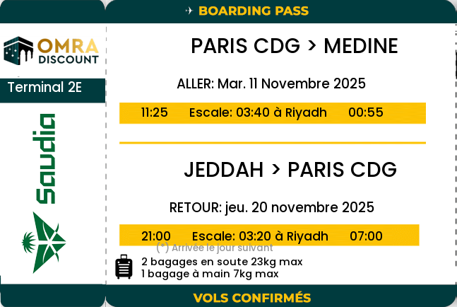EXCELLENT Basée sur 90 avis Publié sur Myriam FaresseTrustindex vérifie que la source originale de l'avis est Google. Aucun regret quand au choix de l agence nous avons étais très bien encadré une grande bienveillance beaucoup de rappelle vraiment merci pour tous k ALLAH vs récompensePublié sur Hassan BakaTrustindex vérifie que la source originale de l'avis est Google. Equipe très organisée ! Programme respecté à la lettre + des extras en plus comme le repas , une soirée spécial palmeraie+ visites musées + conseils pratiques et commerciaux ( puces tel ) en plus ils font la réservation Rawda de Médine à la place du pélerin ! ( Créneau hyper saturé ) . Très franchement je recommande ! Ils sont au petit soin jour et nuit ! Merci à tous . اللهم باركPublié sur djenebou diarraTrustindex vérifie que la source originale de l'avis est Google. Voyage au top ! Organisation au top ! Ils sont vraiment sur la sunnah et prône le tawhid à chaque fois… c’était vraiment bien ! Guide au top. Hôtel au top ! Cependant à mon sens il manquait quelques activités ou sortie à faire en groupe. On avait pas mal de temps libre ce qui est très bien, mais peut être mettre en place un guide pour ceux qu’ils veulent faire des activités en groupe « comme faire des musées, visiter les souk, aller à la mer rouge… Mais sinon agence sérieuse !Publié sur Rizlène BarihiTrustindex vérifie que la source originale de l'avis est Google. J’ai voyagé avec OmraDiscount du 17 mars au 3 avril 2025, en pleine période de Ramadan, et tout était tout simplement parfait. L’organisation était au top du début à la fin, l’hôtel magnifique et très bien situé. Les visites étaient bien planifiées et enrichissantes. Mention spéciale pour le guide Mouloud Abou Abderahmane vraiment exceptionnel, toujours disponible et très professionnel. Je recommande vivement OmraDiscount pour une Omra sereine et bien encadrée. Merci pour cette belle expérience ! Qu’allah vous récompense grandement 🤲🏽Publié sur Wassef Ben SassiTrustindex vérifie que la source originale de l'avis est Google. Du sérieux de A à Z. Très bonne agencePublié sur Sociale InformatiqueTrustindex vérifie que la source originale de l'avis est Google. Magnifique voyage excellente organisation encore merci à Mouloud notre responsable de groupe pour sa gentillesse et sa disponibilitéPublié sur Baraa SalemTrustindex vérifie que la source originale de l'avis est Google. J’ai eu le privilège de voyager à Madinah et Mecca avec l’agence Omra Discount du 10 au 20 février, et SubhanAllah, c’était tout simplement le meilleur voyage de ma vie. L’organisation a été impeccable du début à la fin. Les guides étaient toujours présents, attentifs et à l’écoute de nos besoins. Une pensée pour Mouloud et Amine qui se sont véritablement occupés de nous comme tous les autres frères avec beaucoup de bienveillance, en veillant à ce que chaque étape de notre voyage se passe dans les meilleures conditions. Alhamdulillah, tout s’est très bien déroulé et grâce à cette agence, j’ai pu vivre une expérience spirituelle inoubliable. Je recommande cette agence à 100%. BarakAllahoufikoum pour tout ce que vous avez fait pour nous, et je n’hésiterai pas à refaire appel à vous pour une future autre Omra.Publié sur Nora OukTrustindex vérifie que la source originale de l'avis est Google. Nous sommes très satisfaits de ce beau séjour, l'organisation et la prise en charge était au top. Je remercie notre guide Hicham qui a été à la hauteur non seulement sur l'organisation et la guidance tout au long de notre séjour. Il a été disponible, bienveillant et surtout c'était l'occasion de partage de ses connaissances sur le rite d'une omra. Jahaza allah kairan ya allah.Publié sur umm amineTrustindex vérifie que la source originale de l'avis est Google. Ça a été un voyage magnifique. Qu'Allah accepte notre omra 🤲🏼 Un grand merci au guide Hassan pour son accompagnement et ses rappels quotidiens. Merci également au frère Sofiane, étudiant en sciences, pour ses dourous Jazakoumou Allahou khayran Je recommande cette agence
